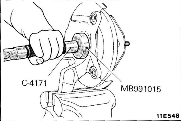 1. Set up the special tool as illustrated. While holding the bolt, turn the nut in the tightening direction to insert the front hub in the knuckle. After the front hub has been completely inserted, tighten the nut to the 200-260 Nm (144-188 ft.lbs) torque.