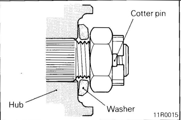 3. If the position of the cotter pin holes does not match, tighten the nut up to 260 Nm (188 ft.lbs) in maximum.