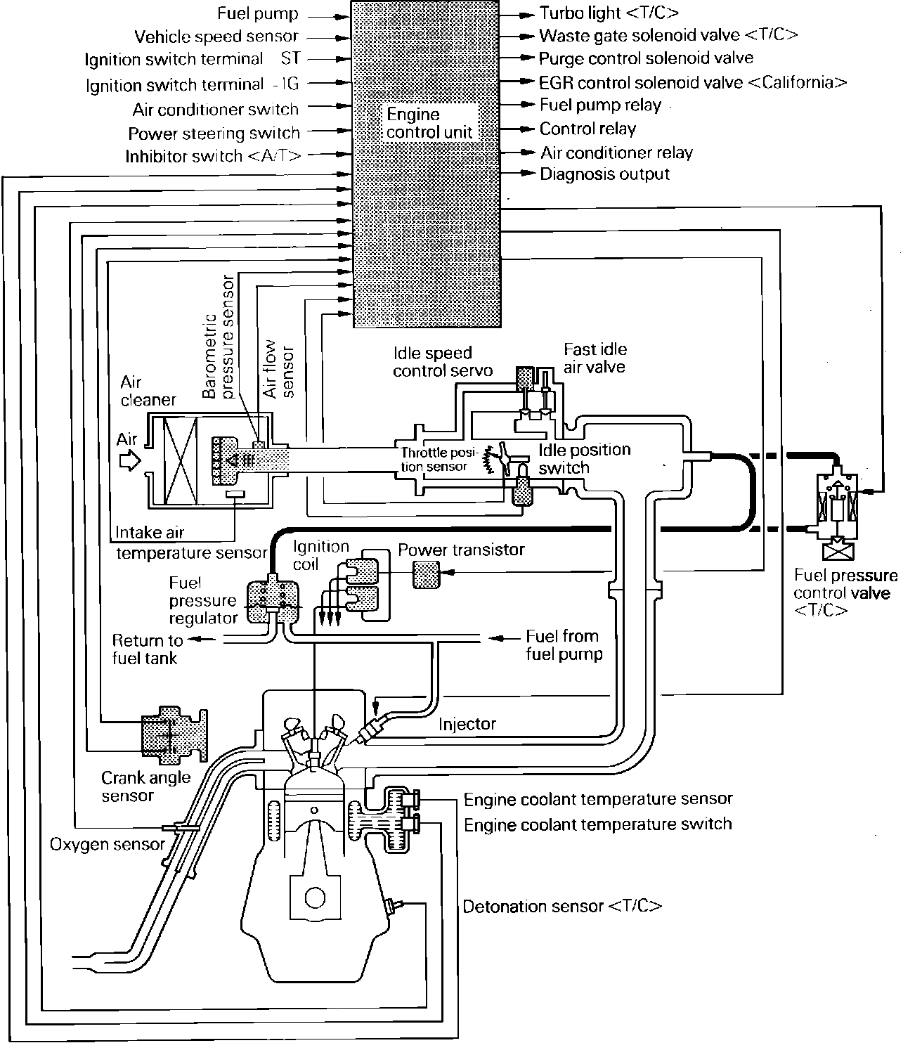 If Turbocharger pressure gets too high, predetonation (pinging) may occur, causing engine damage and poor performance. To limit turbo pressure, a Wastegate Valve opens in the exhaust passage and bypasses exhaust flow around the turbine. This serves to slow the rotation of the turbine and therefore the impeller. The Wastegate Valve is opened by a pressure diaphragm that senses the pressure in the air intake, prior to the throttle valve. To insure that fuel injection can be metered accurately, the turbocharger is positioned in the piping after the Airflow Meter, therefore data sent to the ECU concerning intake air volume/temperature will not be affected by intake charge pressurization.
