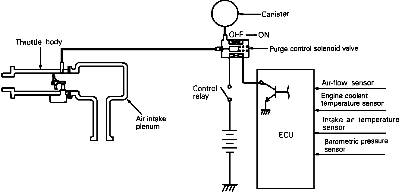 The charcoal canister absorbs and stores fuel vapors until the ECU grounds the purge control solenoid. The purge control solenoid is spring loaded closed (blocks purge), and opens when grounded by the ECU. Throttle ported vacuum is then allowed to purge the canister based on a timer circuit. The ECU will ground the purge control solenoid when the coolant sensor indicates higher than 149°F and the Air Flow Sensor indicates an intake air flow rate of 2000 rpm (100 Hz). Once these parameters have been met, the ECU will ground the purge control solenoid for 3 1/2 minutes of ON time and then Unground the solenoid for 25 seconds of OFF time. This will continue as long as the above parameters are met. During engine warm-up, the purge ON time is progressive. For example, after the coolant sensor indicates above 149°F, the first purge cycle may only be for one minute of purge, then 25 seconds of no purge. When the purge control valve opens, the fuel vapors in the canister are drawn into the intake manifold through purge lines. At the same time, fresh air is drawn through the filter at the bottom of the canister, purging the charcoal of fuel vapors.