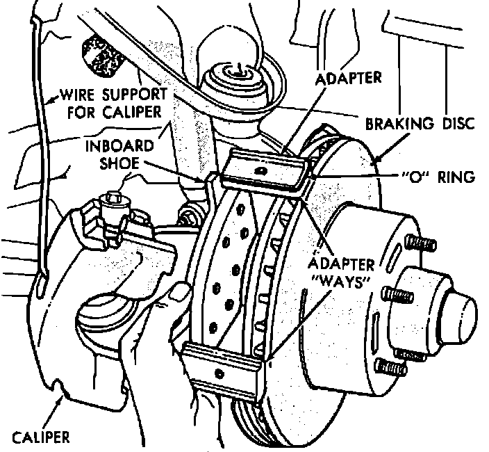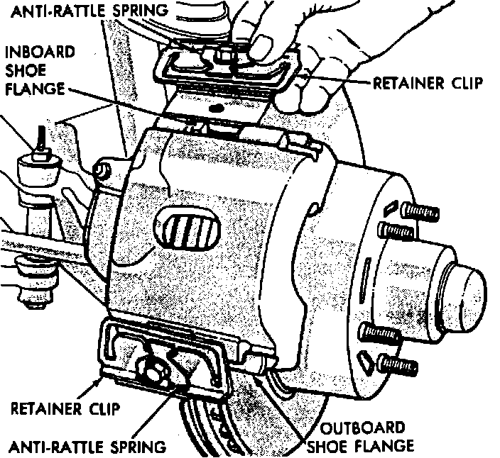 2. Install new outboard pad in recess of caliper. No freeplay should exist between brake pad flanges and caliper fingers. If up and down (vertical) movement of the pad shows freeplay, pad must be removed and flanges bent to provide a slight interference fit. Reinstall pad after modification. If pad cannot be finger snapped into place, use light C-clamp pressure.
