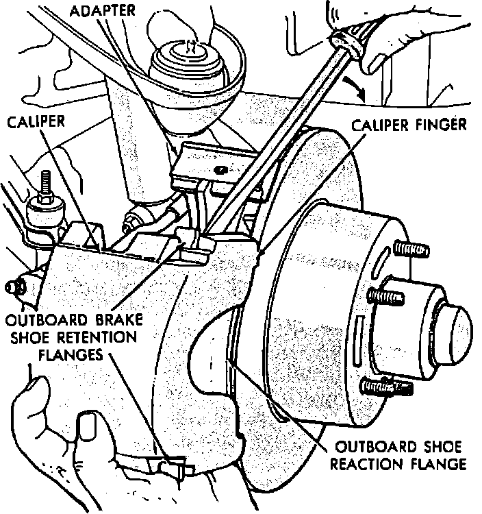2. Remove outboard pad by prying between the pad and caliper fingers. Support caliper to avoid damage to brake hose.