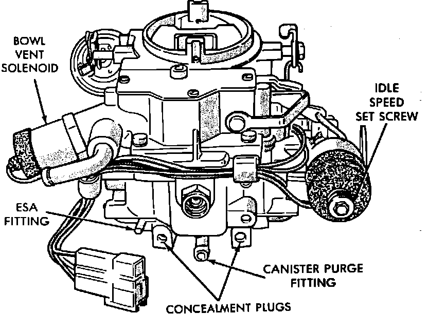 The bowl vent solenoid is mounted on the carburetor. When the engine is not operating, there is a direct connection between the fuel bowl and canister. When the engine is operating the solenoid closes the connection between the fuel bowl and canister.
