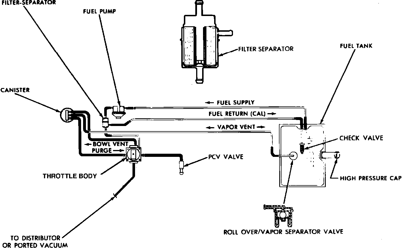 The canister control valve is located on the top of the canister. Manifold vacuum opens this valve to allow purge of both the fuel tank and canister at the same time. The purge line is connected to a ported vacuum source on the throttle body. Purge occurs only when the throttle is above a certain opening, thus preventing purge operation under conditions of low ported vacuum, such as deceleration.