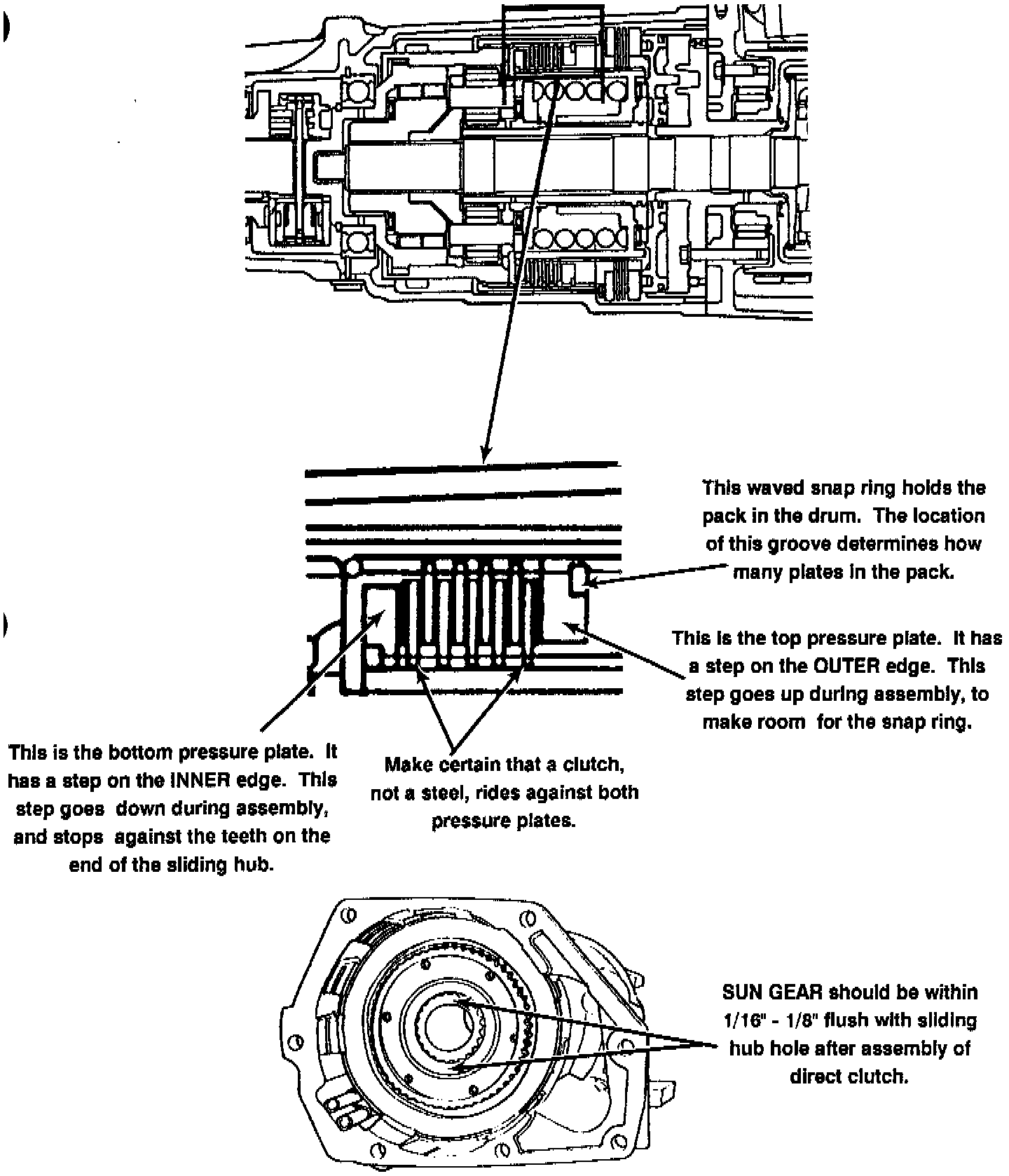 To make certain you've matched up your direct clutch count correctly with your direct drum, just be sure that after you install the top snap ring in the direct drum and release the clutch from the press that the top end of the sun gear is within 1/16" - 1/8" flush with the top of the sliding hub hole.