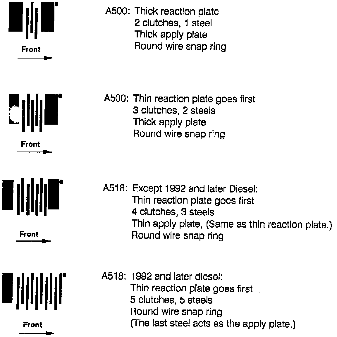 There are three different direct clutch counts possible for the A-500/A-518. The only reliable way to determine direct clutch count is the snap ring groove height.