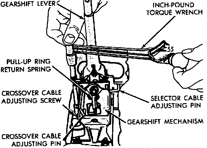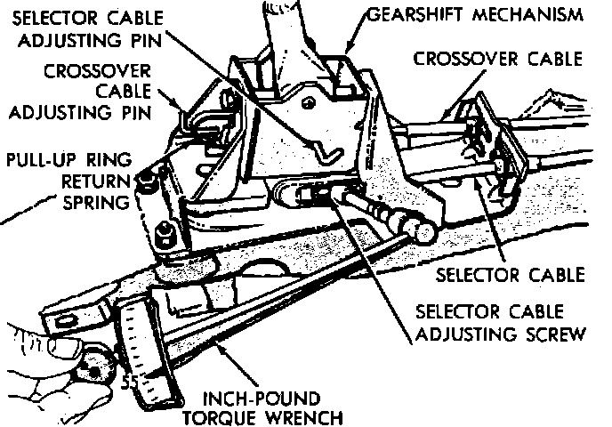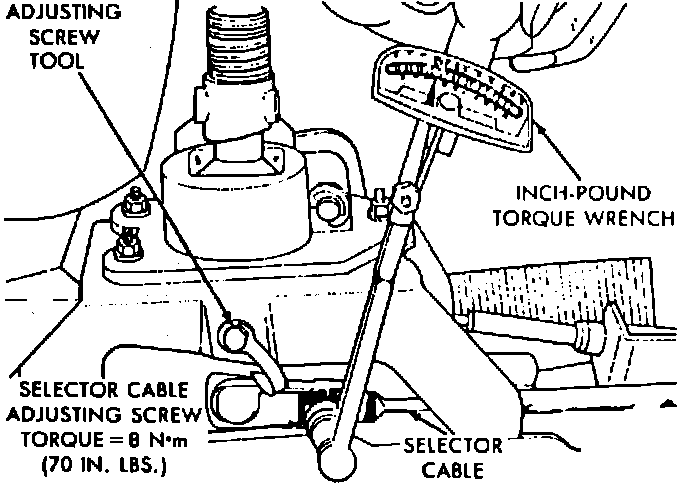 b. Adjust selector cable and torque adjusting screw to specification. The selector cable adjusting screw must be properly torqued.