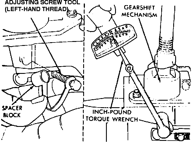 a. Install adjusting screw tool and tighten to 20 inch lbs. Adjusting screw tool, with tethered spacer block, is taped to the shifter support bracket.