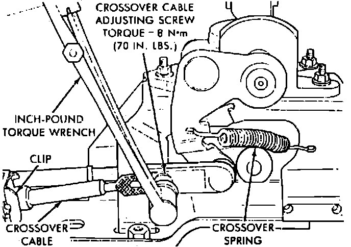 c. Adjust crossover cable and torque adjusting screw to specification. The crossover cable adjusting screw must be properly torqued.