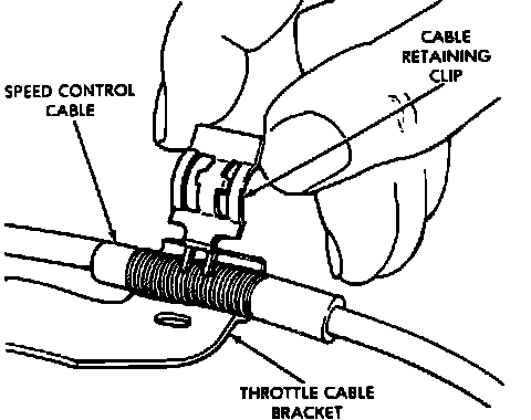 2. Adjust cable by removing cable retaining clip at throttle bracket. Do not pull throttle away from curb idle.