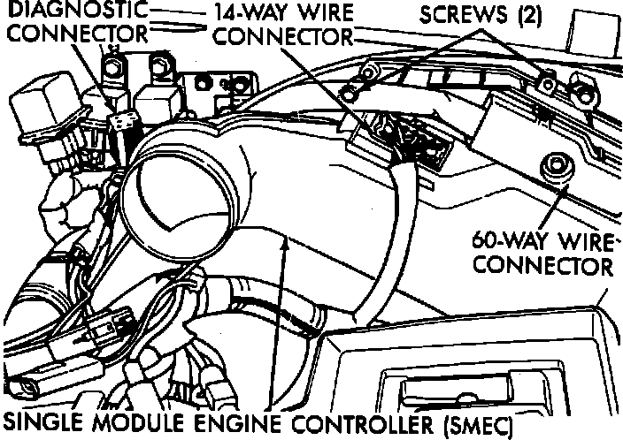 The Diagnostic Connector is found on the left side of the engine compartment, near the Single Module Engine Controller (SMEC).