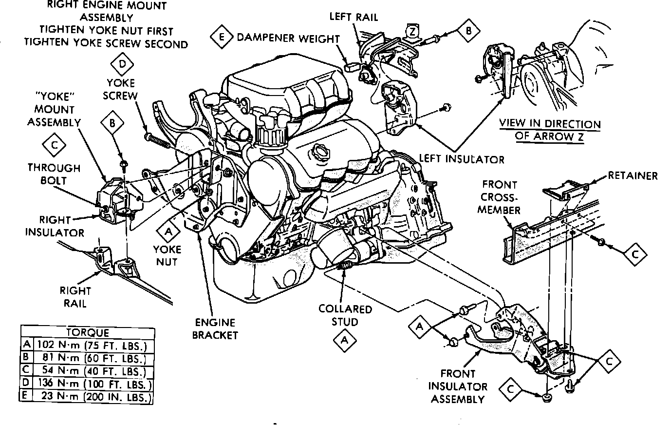 (4) Tighten right engine mount insulator vertical bolts to 81 N-m (60 foot-pounds), tighten front engine mount fasteners to 54 N-m (40 foot-pounds) and "center" left engine mount insulator.