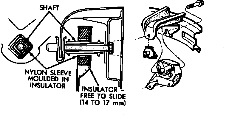 Insulator location on frame rail (right side) and transmission bracket (left side) are adjustable to allow "right/left" drive train adjustment in relation to drive shaft assembly length. Check and reposition right engine mount insulator (left engine mount insulator centers itself with engine weight removed). Adjust drive train position, if required, for the following conditions: