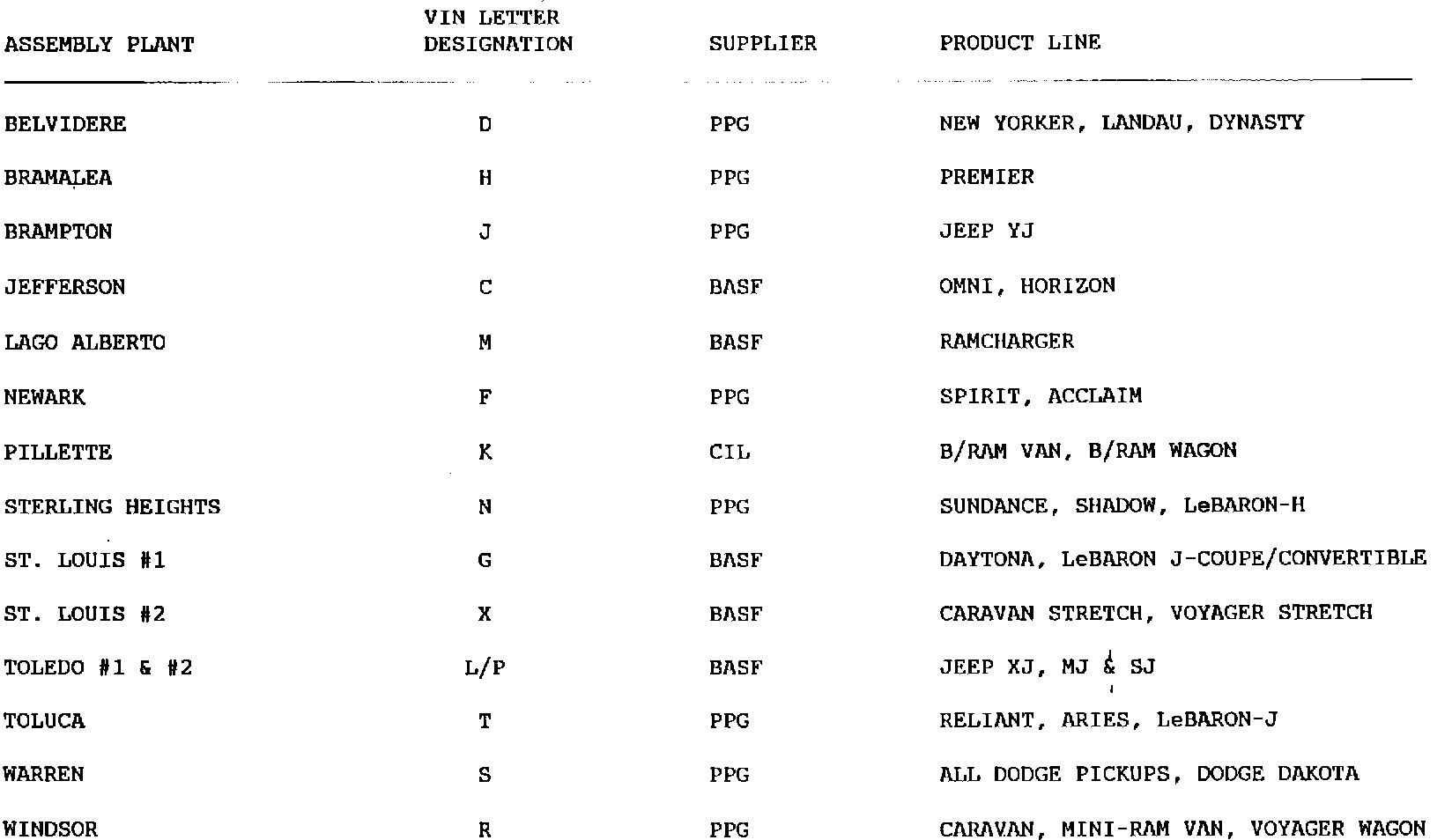 Paint Suppliers/Codes By Assembly Plant