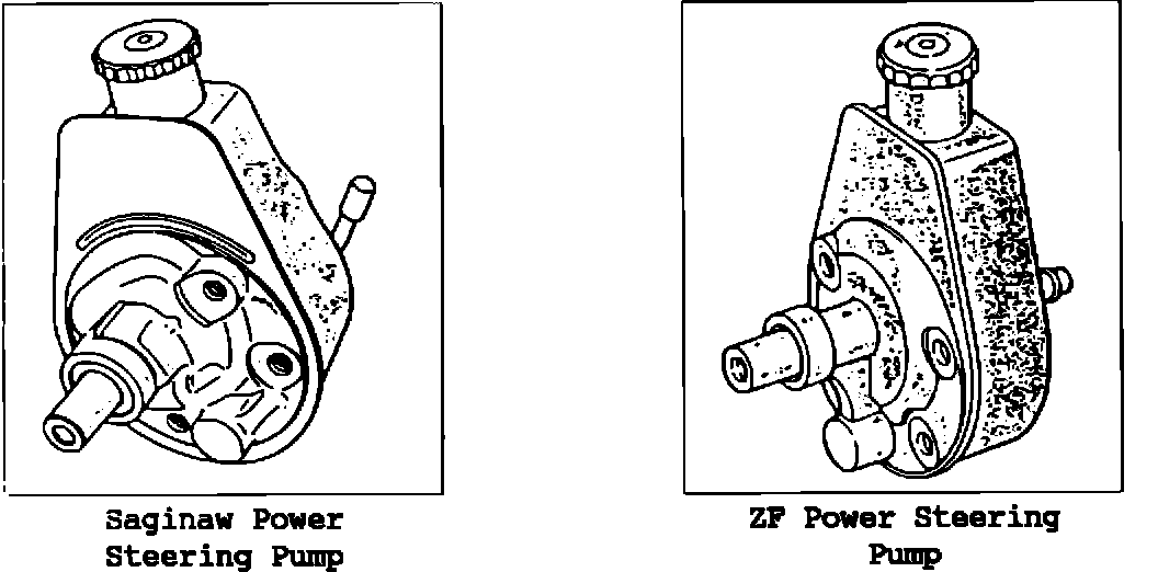 A running change in the supplier of power steering components took place on the AH and AP body vehicles. This change involved the use of the Saginaw Steering Pump in place of the ZF Pump and was implemented on 12/07/88 (MDH). When steering hoses, mounting brackets or pump required, be sure the power steering system is identified correctly before ordering parts. The steering pumps involved in the change are shown below.