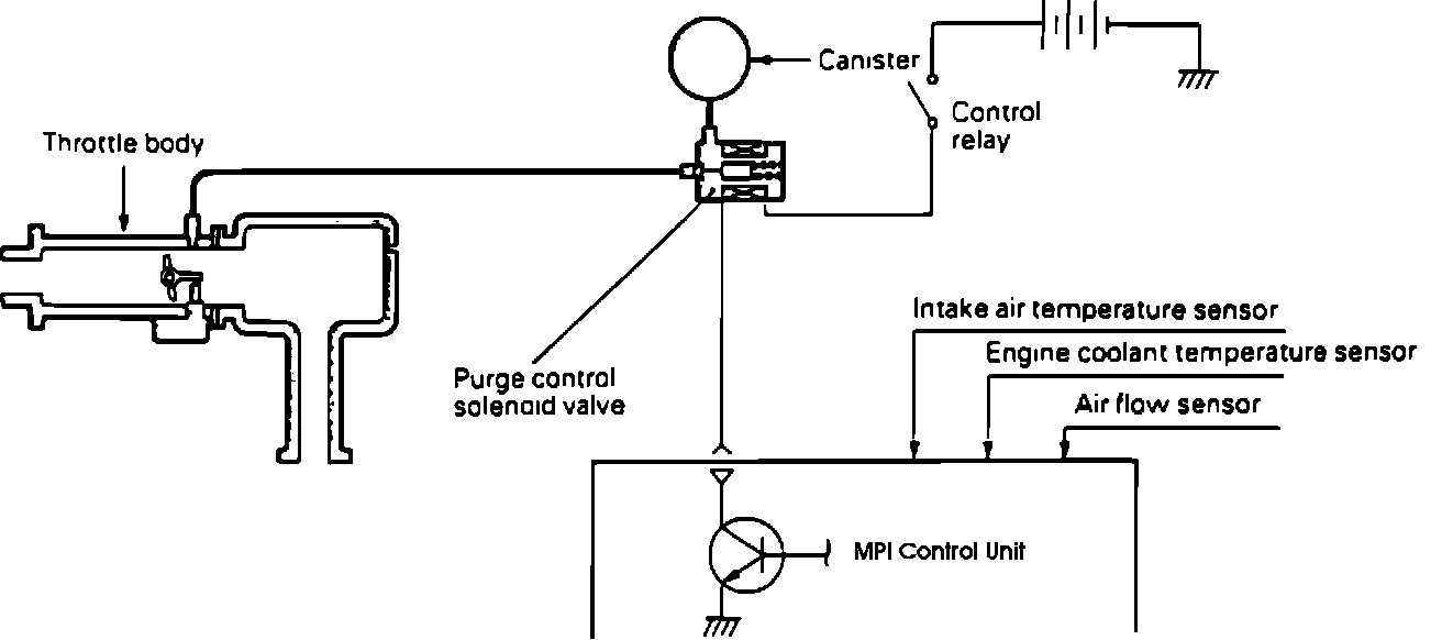 The Purge Control Solenoid Valve is spring loaded closed (blocks purge), and opens when grounded by the MPI Control Unit. The Purge Control Solenoid will be grounded by the MPI Control Unit after the engine coolant temperature sensor indicates 158°F or higher; and the Air Flow Sensor indicates an intake air flow rate equivalent to 3000 rpm. Once the valve opens, manifold vacuum will be applied to the canister, purging it of fuel vapors.