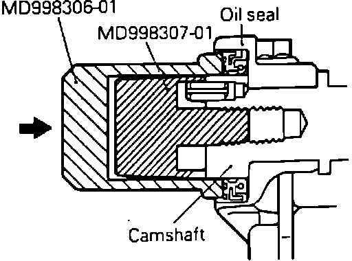 8. Install guide tool No. MD998307 or equivalent, on camshaft, then apply oil to camshaft oil seal and insert the oil seal along the guide tool until it contacts cylinder head, Fig. 28. Using installer tool No. MD998306 or equivalent, press oil seal into cylinder head, then remove the tools.