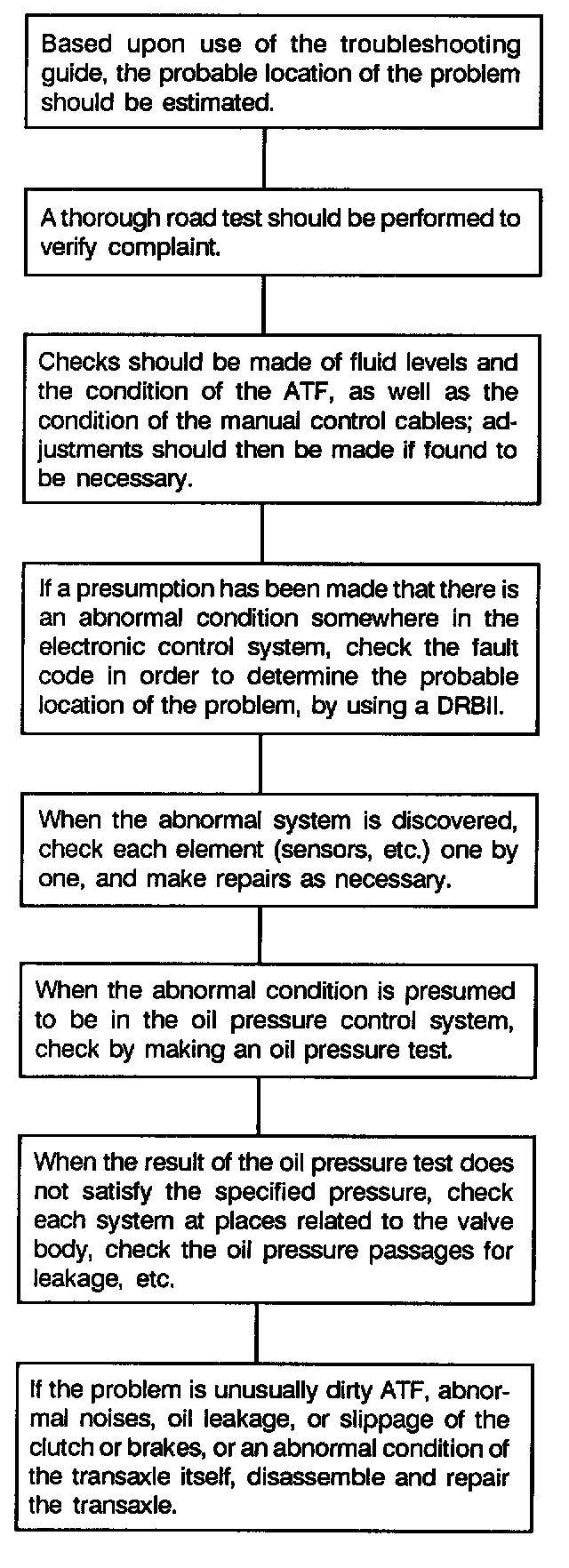 In order to properly determine ("Troubleshoot") the source of these malfunctions, it is first essential to methodically question the user concerning the detalls of the problem, such as the condition of the problem, the situation at the time the problem occurred, and any other relevant information, all in as much detail as possible. The user should also be asked whether or not the problem has occurred more than once, and under what conditions. Road test vehicle to verify the complaint.
