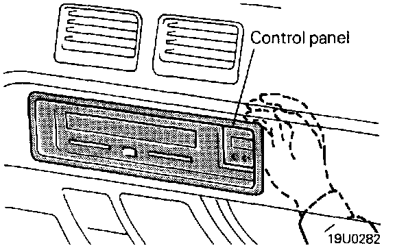 From the back side of the control panel, push the right side control panel clip to the right while pushing the control panel out of the dash panel then allow the control panel to hang.