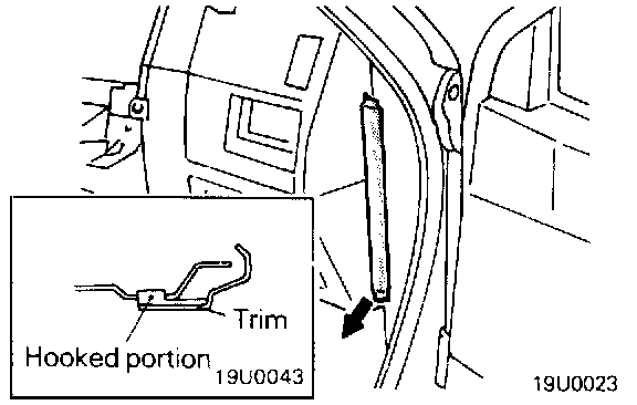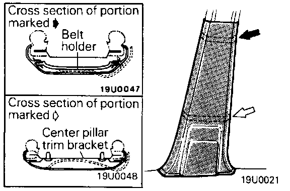 Bend the center pillar trim, lower as illustrated and release it from the center pillar trim bracket and belt holder flanges. Remove the center pillar trim, lower.