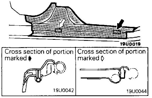 NOTE: Separate the projections of the lower quarter trim (shown by the light colored arrows) from the quarter trim bracket.