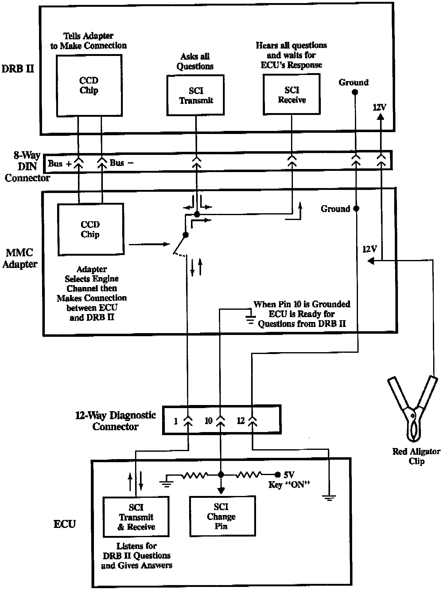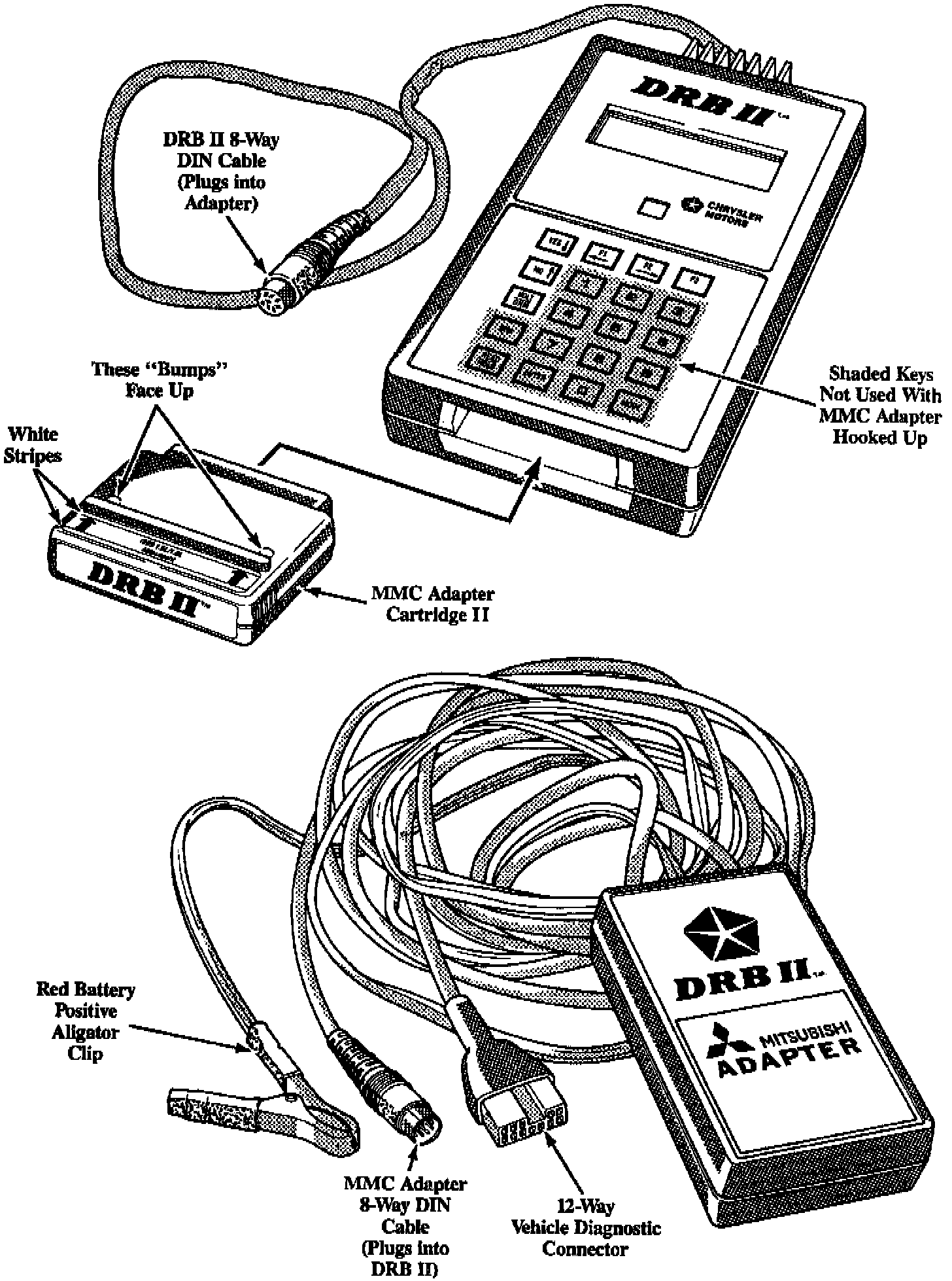 The MMC (Mitsubishi Motors Corporation) DRB II (Diagnostic Readout Box II) Adapter was built so that the existing DRB II could work on all 1989 and later ECI Multi Systems. The Adapter has 3 cables coming out of it. One is for the battery positive (red alligator clip). The second cable is the round 8-Way DIN Cable. The third cable is the 12-Way Vehicle Diagnostic Cable (has Black cover and White 12-Way Connector). The Diagnostic Cable plugs into the vehicles Diagnostic Connector.