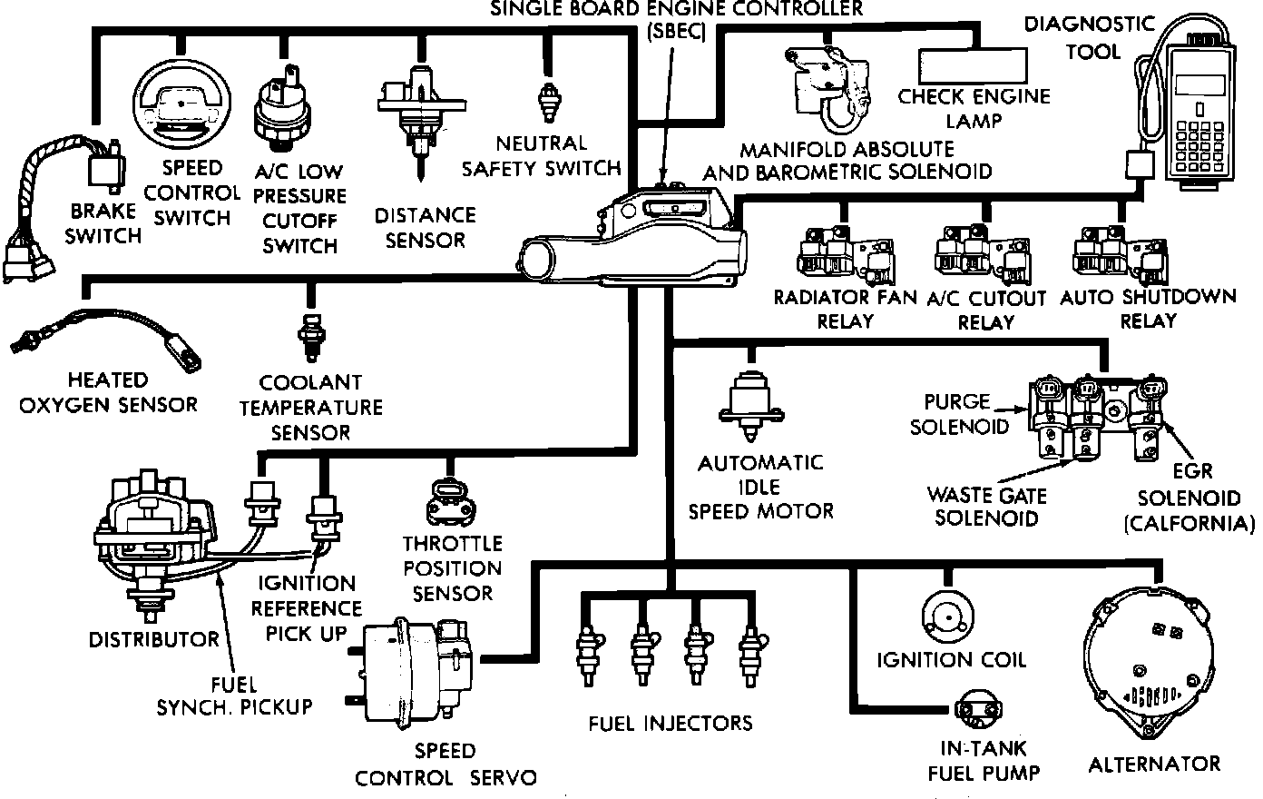 Various sensors provide necessary input for the SBEC to function correctly. These include the Manifold Absolute Pressure Sensor, Throttle Position Sensor, Oxygen Sensor, Coolant Temperature Sensor, Throttle Body Temperature Sensor, and Vehicle Distance Sensors. In addition to these sensors, various switches and relays are used to carry out commands or outputs from the SBEC.