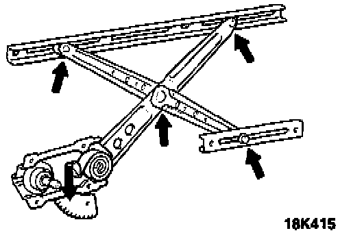 Apply a coating of chassis grease to the sliding parts and rotating parts of the window regulator.