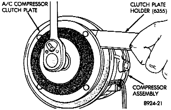 6. Remove clutch coil retaining snap ring and pull the coil from the assembly. When installing the clutch coil, align the pin on the front of the compressor to the middle hole in the hub of the coil and position the pin in the snap ring gap.