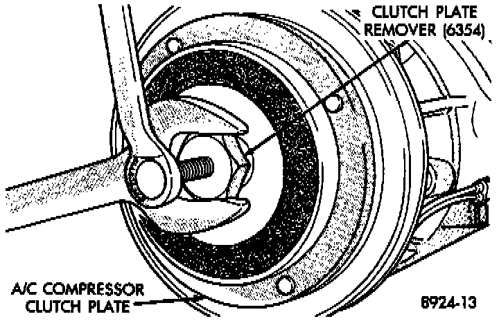 3. Using a suitable puller, remove the clutch front plate from the assembly. When installing the front plate, select the proper shims to achieve a 0.9mm (0.035 in.) air gap to the pulley surface. To install front plate, align shaft key to groove in front plate hub and push on until it seats, measure the air gap.