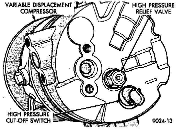The High Pressure Relief Valve when used with a Variable Displacement Compressor is located on the rear of the compressor. It's function is to prevent damage to the air conditioning system in the event that excessive pressure develops due to condenser air flow being restricted overcharge of refrigerant, or air and moisture in the A/C system.