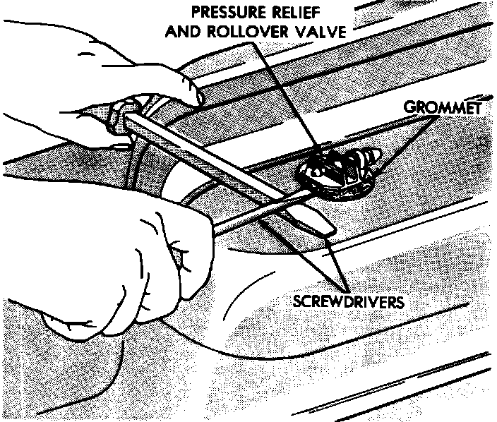 3. Slide the blade of a screwdriver between the rubber mounting grommet and the fuel tank, making sure not to slide the screwdriver between the roll-over valve and grommet. Use a second screwdriver to brace the first and pry the roll-over valve out of the tank.