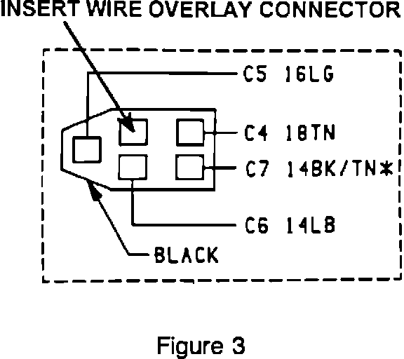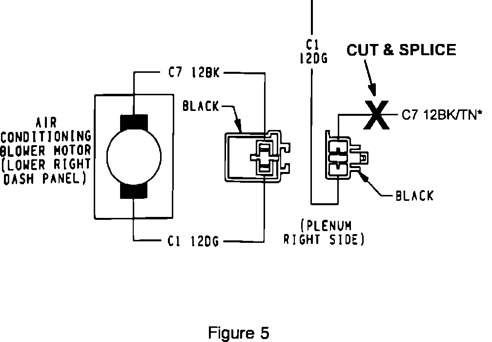 7. On the inside passenger side compartment, cut the C7 (12BK/TN*) wire approximately 2" from the blower motor wiring harness, black 2-way connector, see Figure 5. Seal off the harness end of the wire with heat shrink sleeve P/N 4419644. Slide another heat shrink sleeve P/N 4419644 over the wire overlay. Splice and solder the overlay wire P/N 4741933 to the short length of wire left at the connector, following the wiring repair procedures outlined in the appropriate service manual. Reinstall the black 2-way connector to the blower motor harness connector.