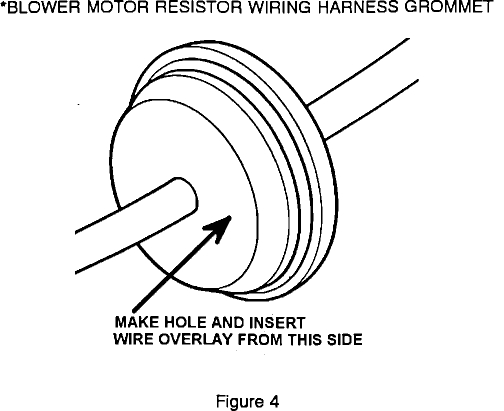 6. Locate the blower motor resistor wiring harness grommet and carefully push the grommet and harness through the dash panel. Feed the wire overlay P/N 4741933 through the dash also. In the passenger side compartment, using an awl or similar tool, make a hole in the grommet as indicated in Figure 4. Feed the open end of the wire overlay through the grommet on the side indicated. Using two tie straps, P/N 6015756, secure the overlay wire to the existing blower motor resistor harness. Feed the wire overlay and blower motor resistor wiring harness back through the hole in the dash panel, and secure the grommet in place and plug the black 5-way: connector onto the new resistor block.