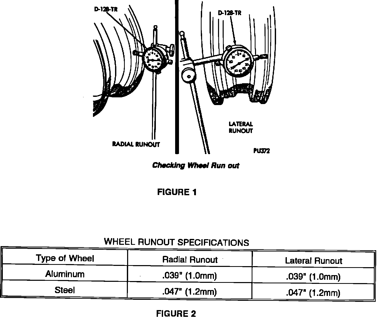 6. Using a dial indicator, check wheel runout as shown in Figure 1. Refer to Figure 2 for REVISED Wheel Runout specifications.