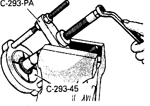 9. Mount companion flange attached to taper roller bearing puller tool No. C-293-PA and bearing remover tool C-293-45 or equivalents in a vise as shown. Pull drive pinion rear bearing inner race out of companion flange.