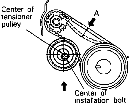 a. Temporarily install timing belt B tensioner to that center of tensioner is to the left and above the installation bolt.