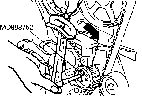 6. Using spanner wrench tool Nos. MB990767 and MD998719 or equivalents, remove camshaft sprocket nut and sprocket.