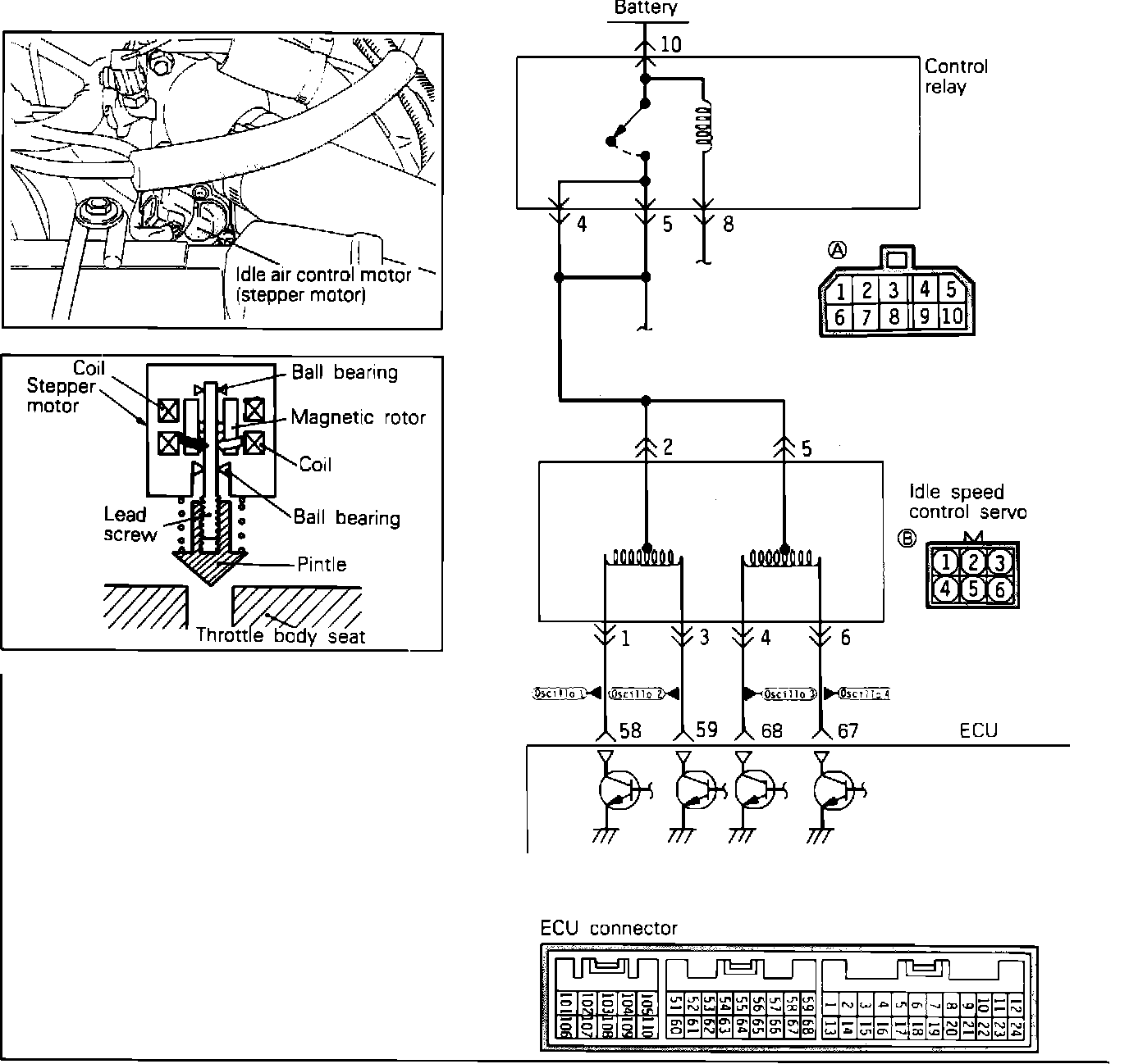 The ECU uses several sensor inputs to determine the operating condition of the engine and the loads being placed on it. The ECU adjusts the idle for air conditioning and automatic transmission loads, and controls fast idle for cold start. The ECU uses the idle air control (IAC) servo to make all of the adjustments to idle speed.