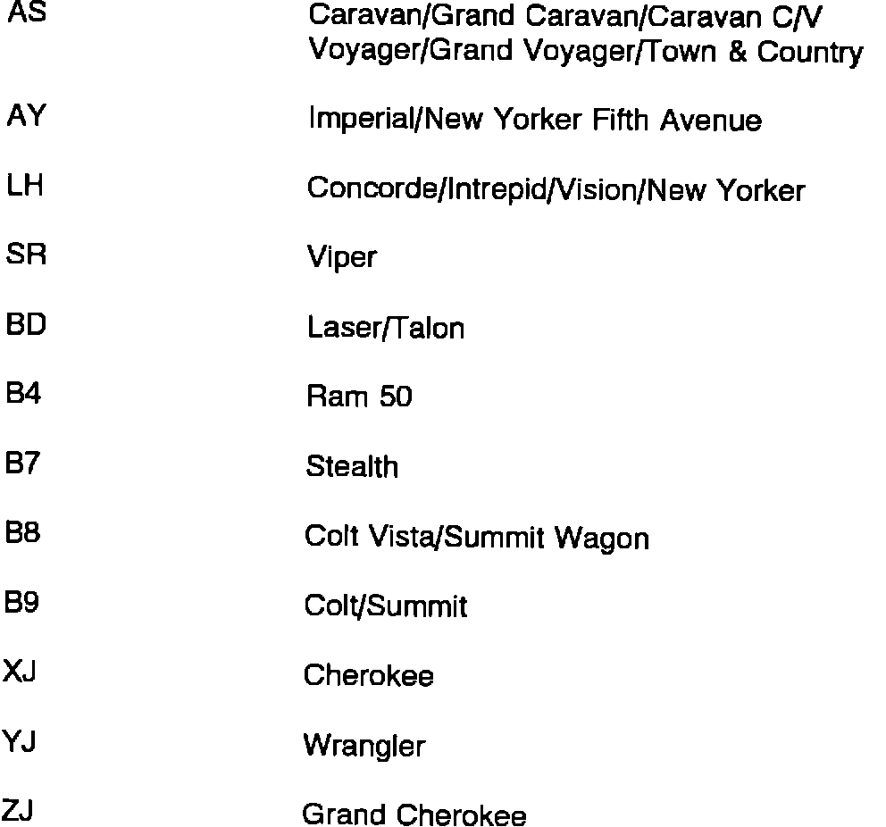 All vehicles in the 1993 Chrysler Motors line-up have been assigned a two-character body code, (example: AA - Body) instead of the model name, (example: Spirit). Using body codes in the Technical Service Bulletins helps clarify which vehicles are being addressed in the bulletin.