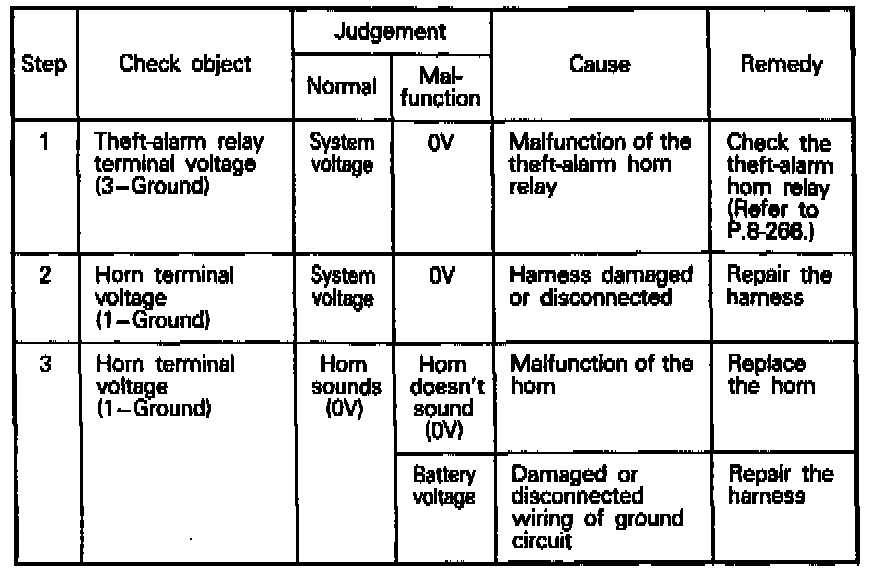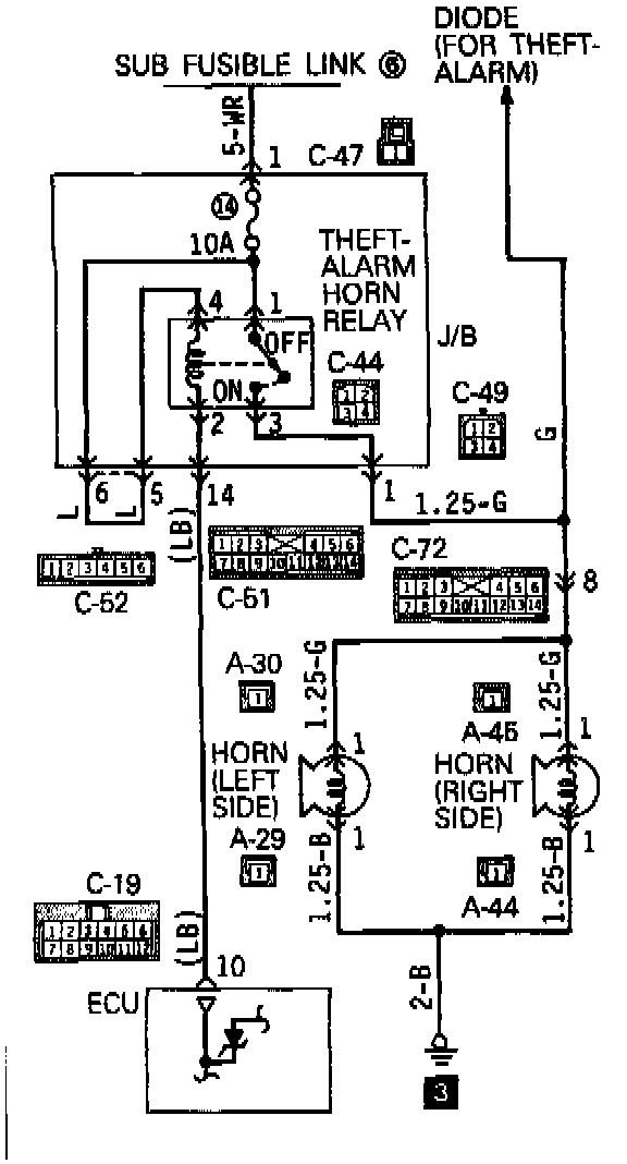 Disconnect the connector of the ECU, then short-circuit terminal No. 10 (LB line), and activate the theft-alarm horn relay.