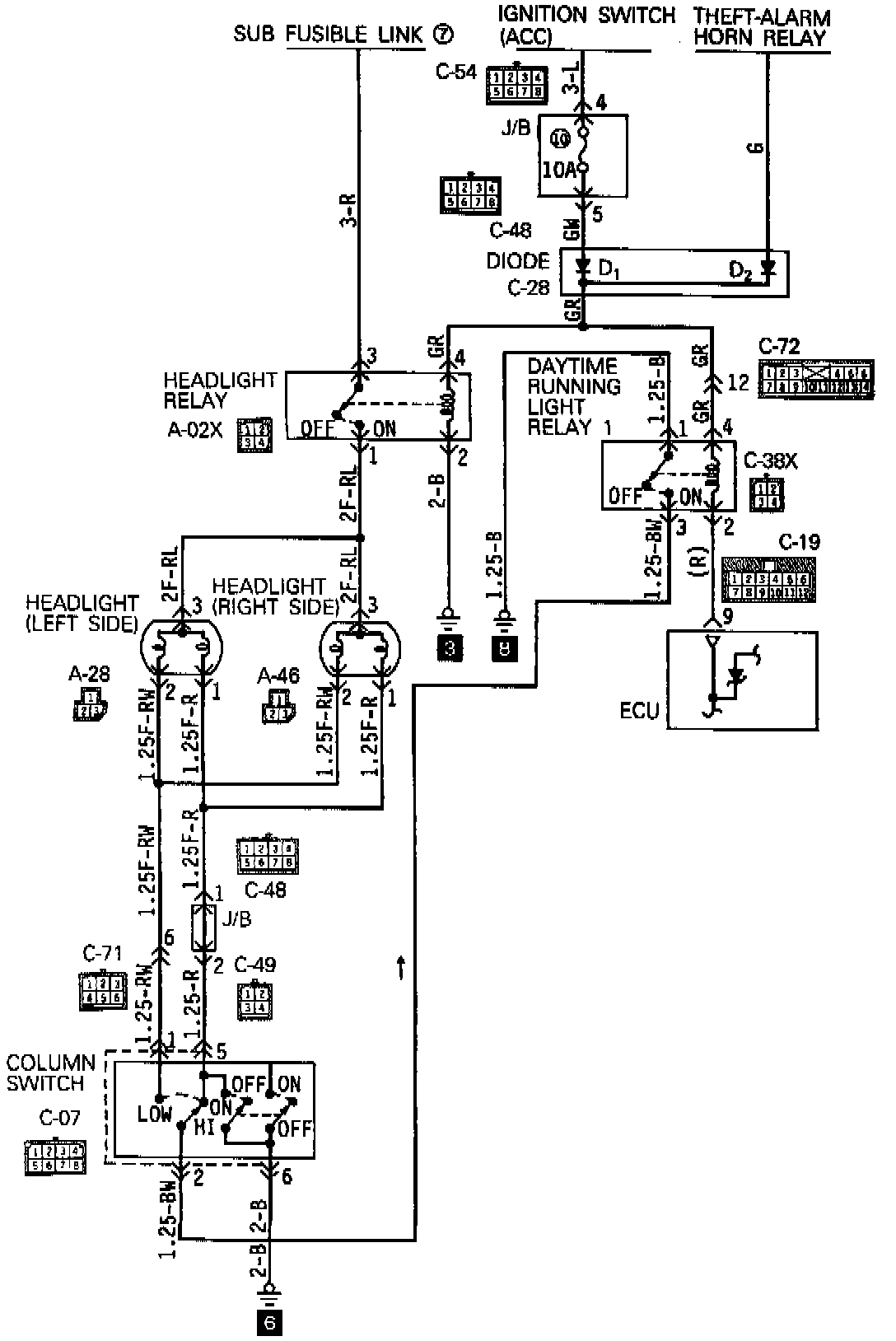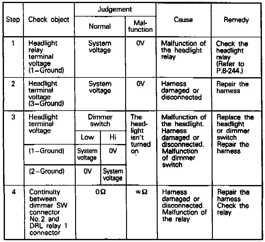 Disconnect the connector of the ECU, then short circuit terminal No. 9 (R line) and activate the headlight relay.