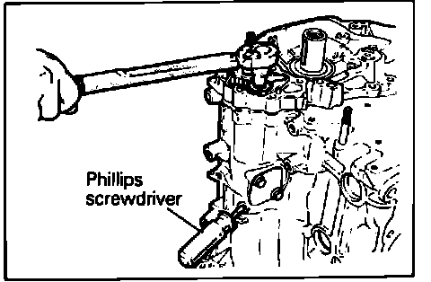 3. When removing oil pump driven gear flange bolt, insert a Phillips screwdriver into plug hole on left side of cylinder block, to block the silent shaft.
