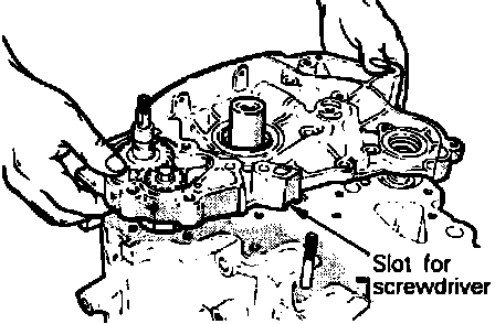 4. If front case will not come loose from block once all attaching bolts are removed, insert a flat screwdriver into slot as shown and pry case away from block. Do not pry in any other location on case.