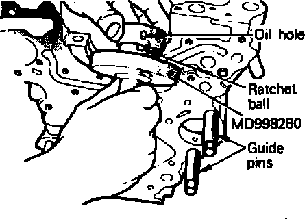 10. When installing oil pressure switch, coat threads of switch with gasket adhesive. Do not allow hole in end of switch to be covered with adhesive. Install switch using oil pressure switch socket No. MD998054 or equivalent.