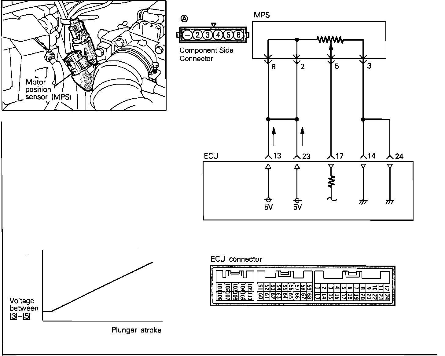 The Motor Position Sensor (MPS) is a variable resistor type sensor. The MPS uses a plunger (contact) that is connected to the ISC servo and a set of electrical windings that are stationary.