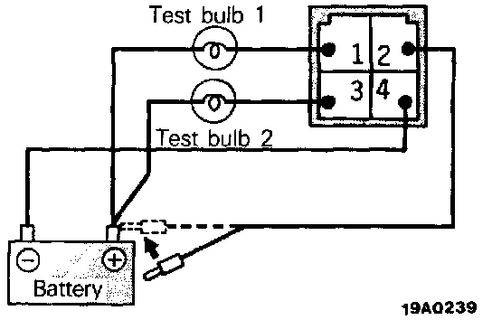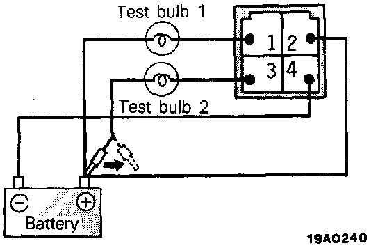 3. Make sure that when terminal 2 is connected to the positive (+) terminal of the battery, test bulbs 1 and 2 are lighted for approx. 6 seconds.