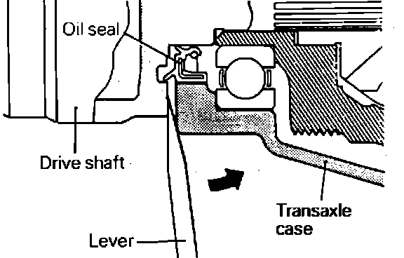 7. Insert a pry bar between the transaxle case and the driveshaft and pry driveshaft loose from the case, Fig. 3. Do not pull on driveshaft or insert pry bar too deep or oil seal will be damaged. Secure driveshaft away from transaxle with rope or wire.