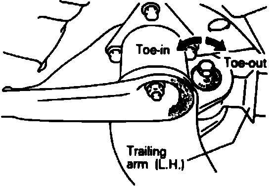 2. If toe-in is not within specifications, adjust by moving the mounting bolts located on the crossmember side of the trailing arm.