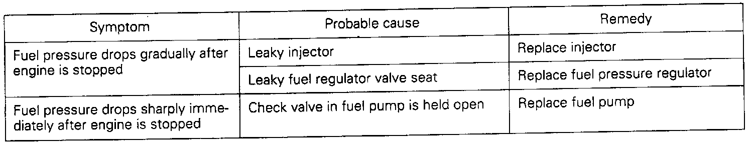 13. If any of fuel pressure measured in steps (8) to (11) is out of specification, troubleshoot and repair according to the table below.